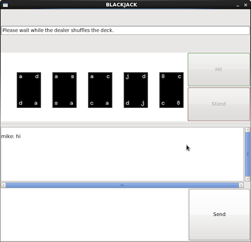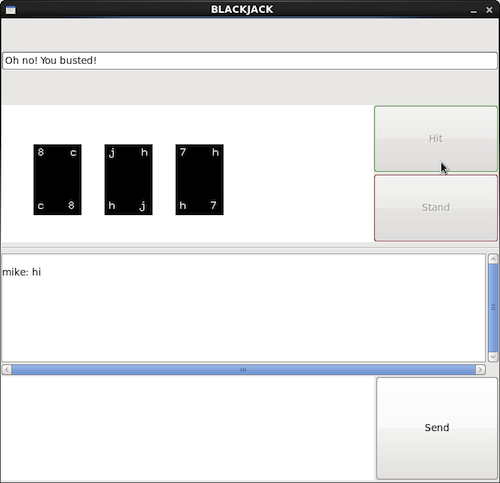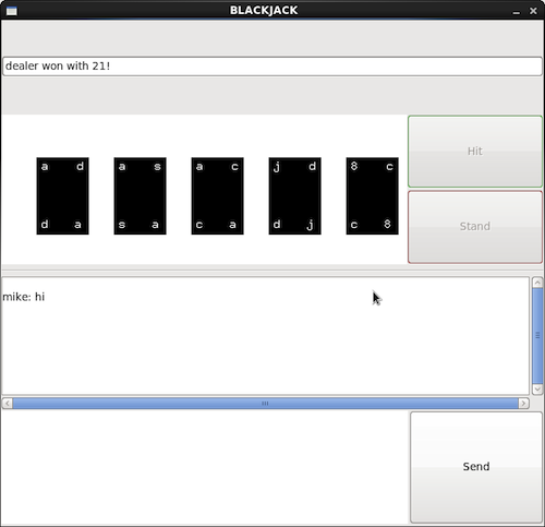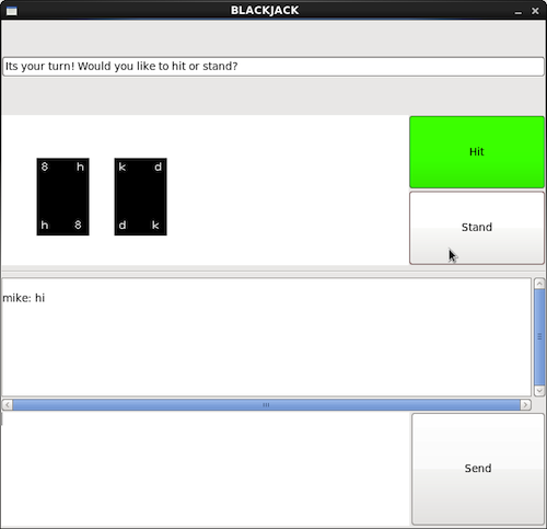 In my Computer Networks class, we were tasked with creating any program that utilized a client-server model. Partially inspired by the fact that one of our group members was an exchange student from Brazil, we created a BlackJack game with an international chat feature. By utilizing the power of Microsoft's free translation service, we were able to create a BlackJack game written in C that can be played by people all over the world. It features the ability to drop and join games, as well as the creation of multiple game instances on one server. Check out a few screenshots!